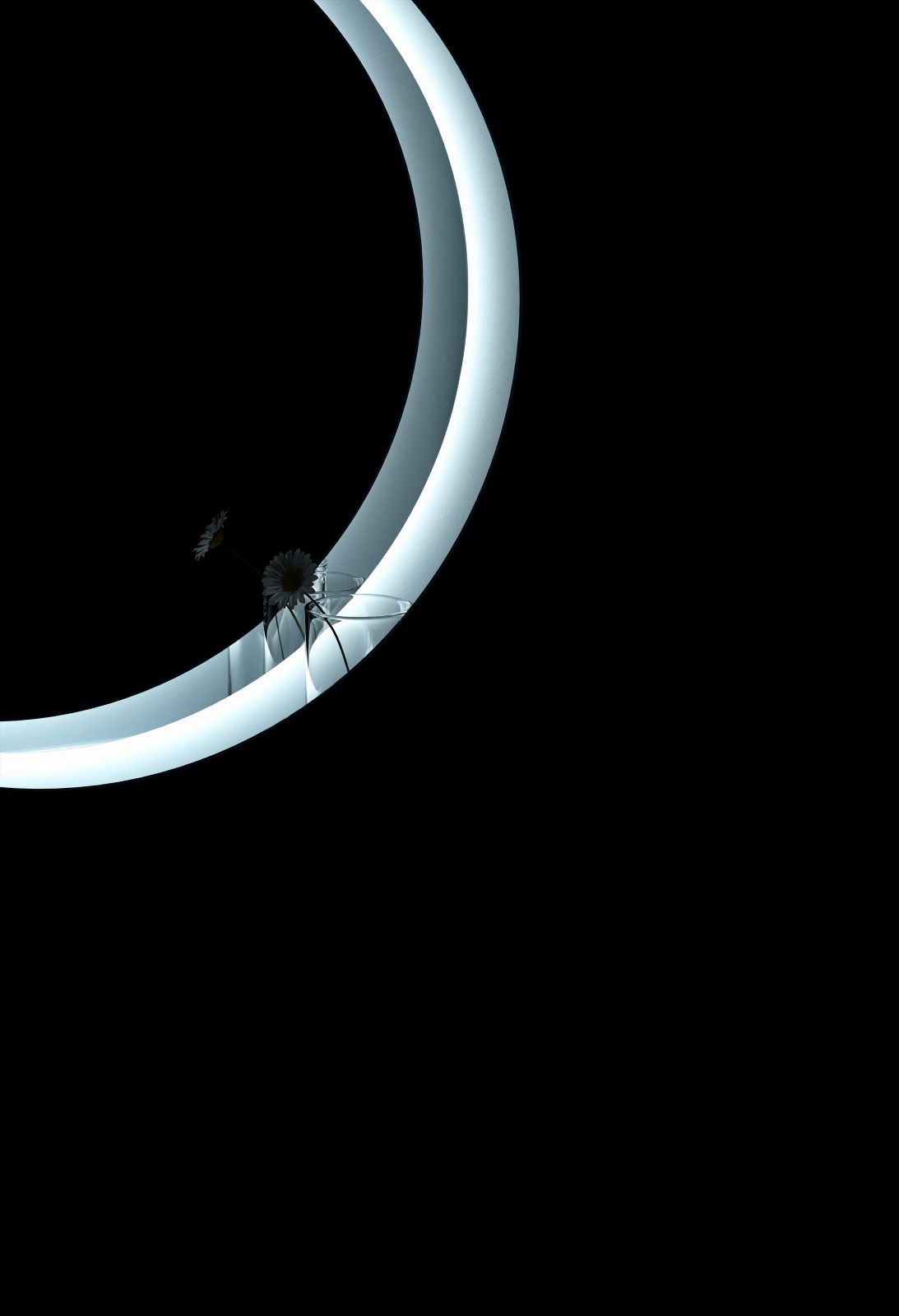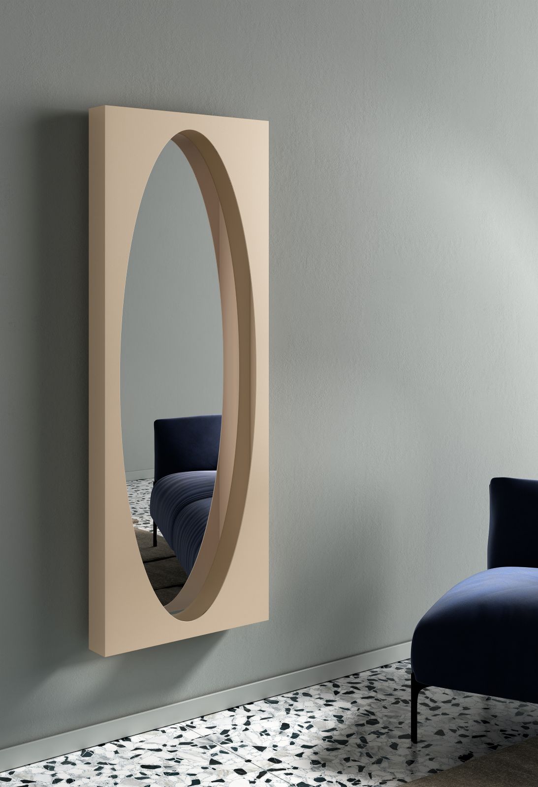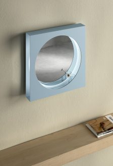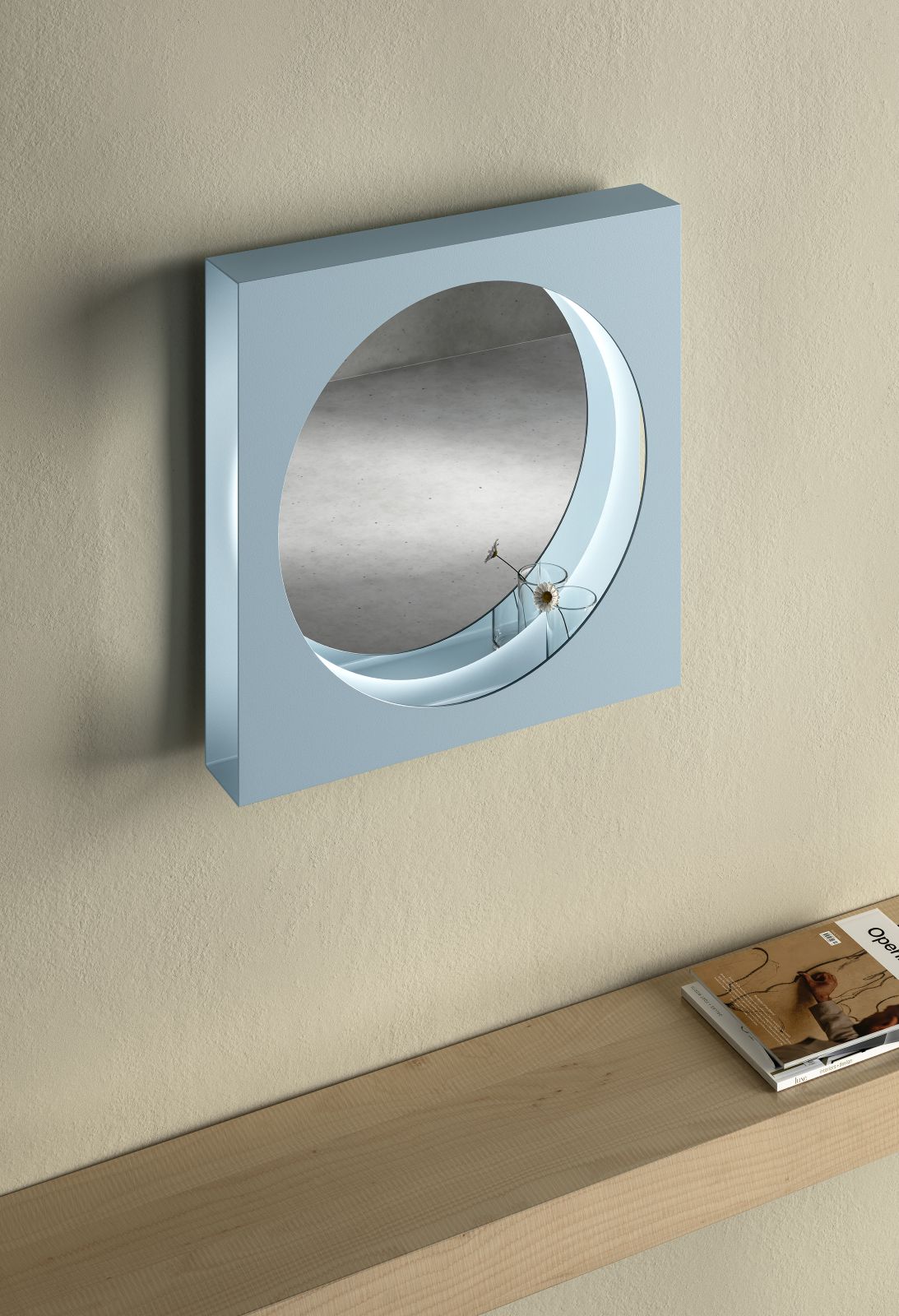 Costruito come un volume squadrato aperto su un lato, presenta al centro un foro dal disegno ovale o circolare. All’interno, invece, superfici completamente specchianti generano riflessi stratificati e una profondità visiva che varia a seconda dell’angolazione. La base si trasforma in un piccolo ripiano.