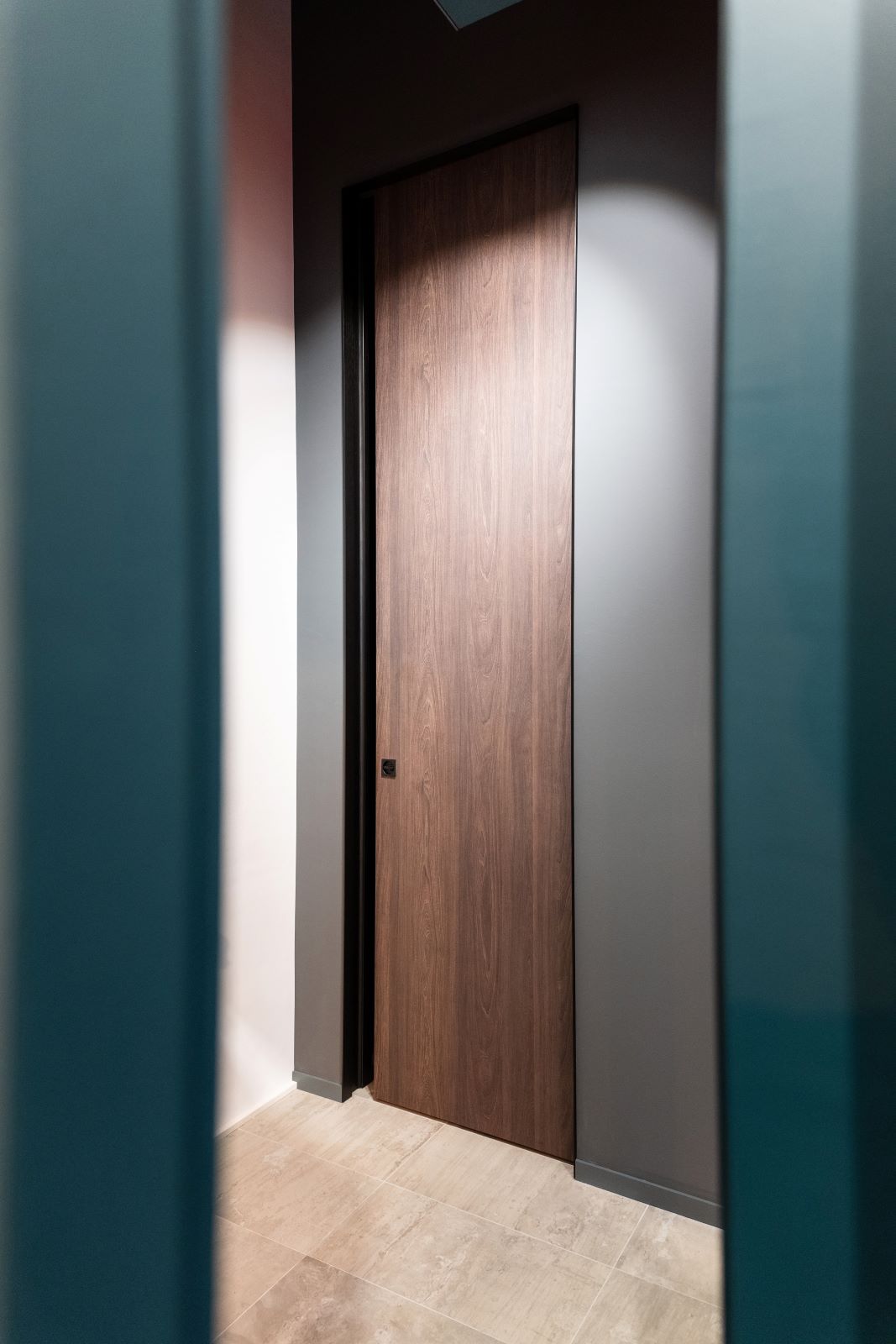 Al centro, su due quinte, sono esposte tre soluzioni che ben riassumono l’ampiezza delle opportunità offerte ai progettisti. Visibile fin dalla soglia di ingresso ed elemento cromatico che cattura lo sguardo, la porta a battente Fifty laccata rosso lucido e alta ben 3 metri diventa manifesto della capacità di realizzare porte architetturali su misure custom, curate in ogni dettaglio, non solo in termini di finiture ma anche, e soprattutto, a livello tecnico-strutturale, per durare nel tempo.