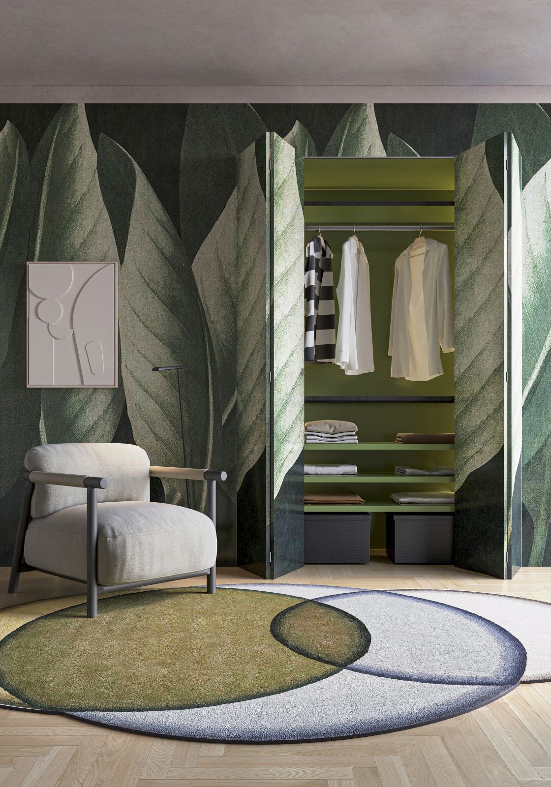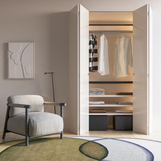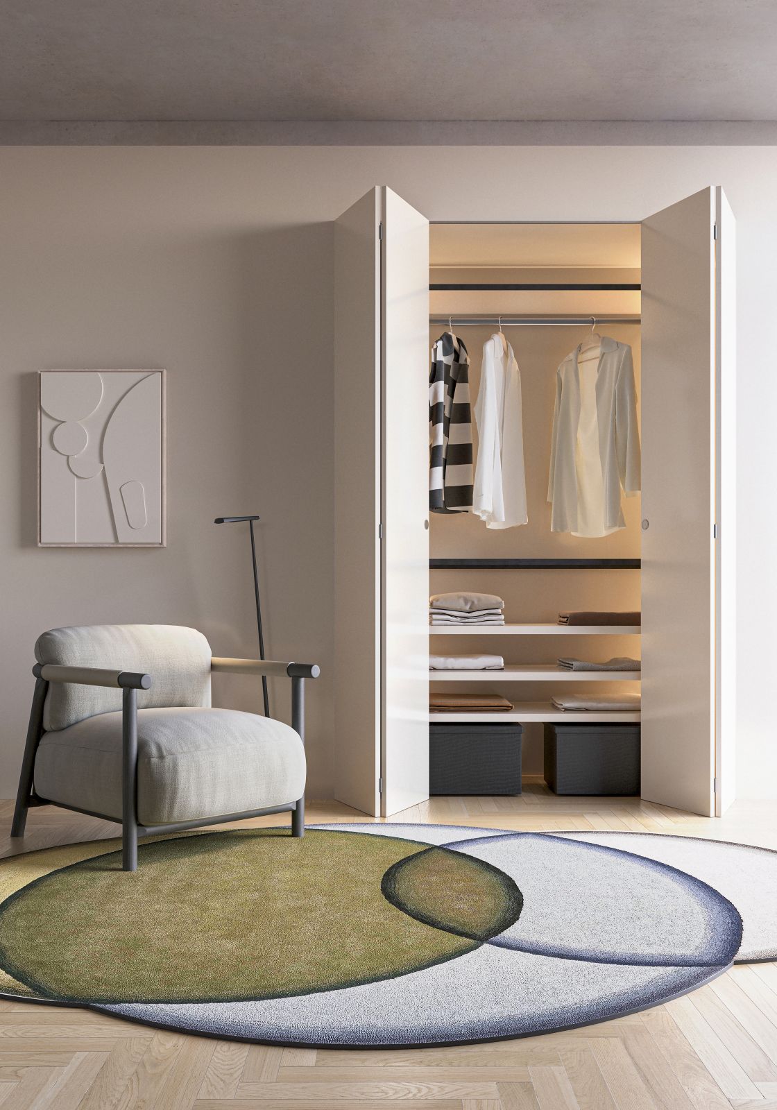 Velia si distingue per l’eccezionale libertà compositiva e modularità. Il sistema può includere fino a otto ante, permettendo di realizzare armadiature filomuro che raggiungono i tre metri di altezza e superano i cinque metri di larghezza. Grazie alla variante trapezoidale, Velia si adatta perfettamente anche a geometrie complesse come sottoscala e mansarde con altezze irregolari, mentre le versioni a libro ottimizzano l’ingombro negli spazi più contenuti.