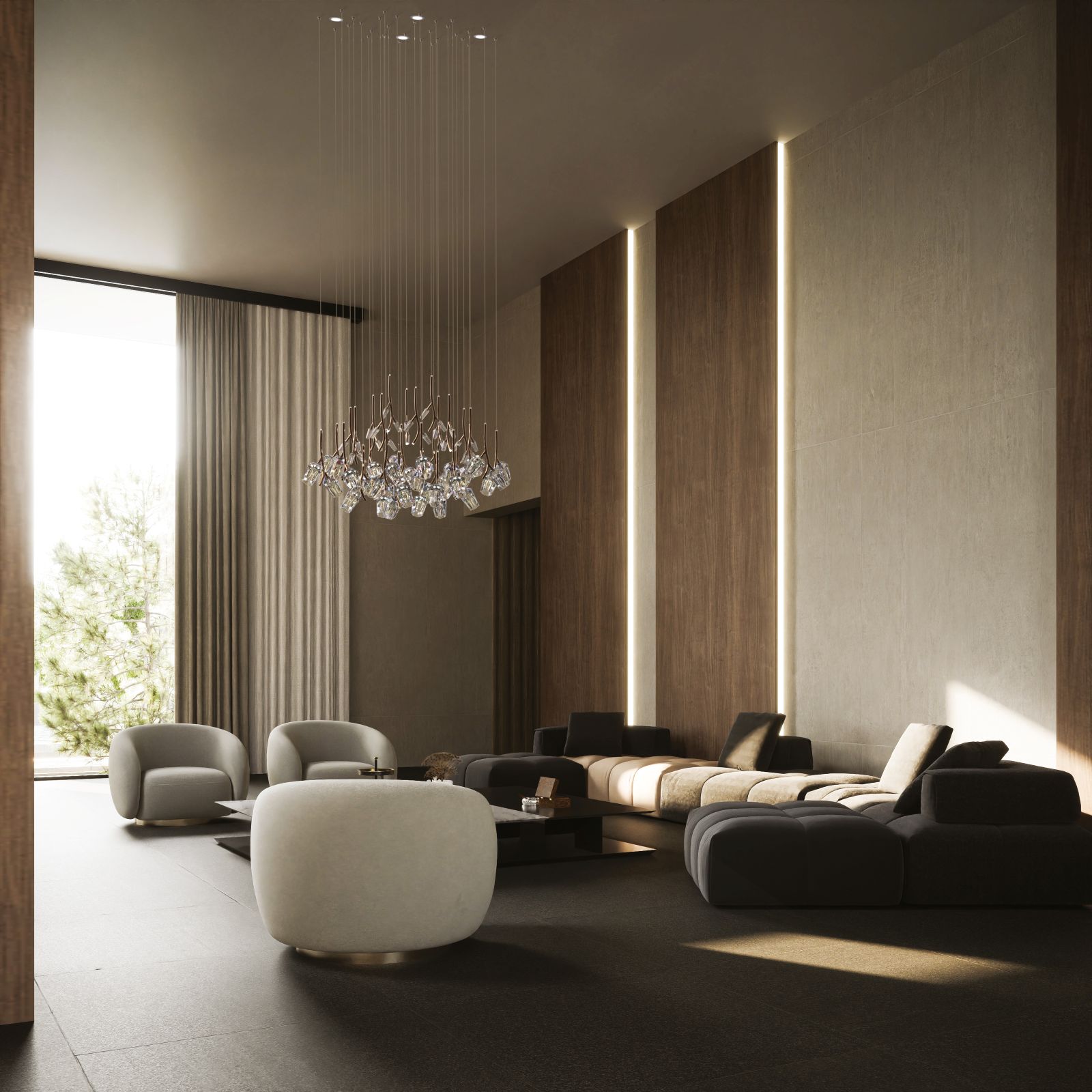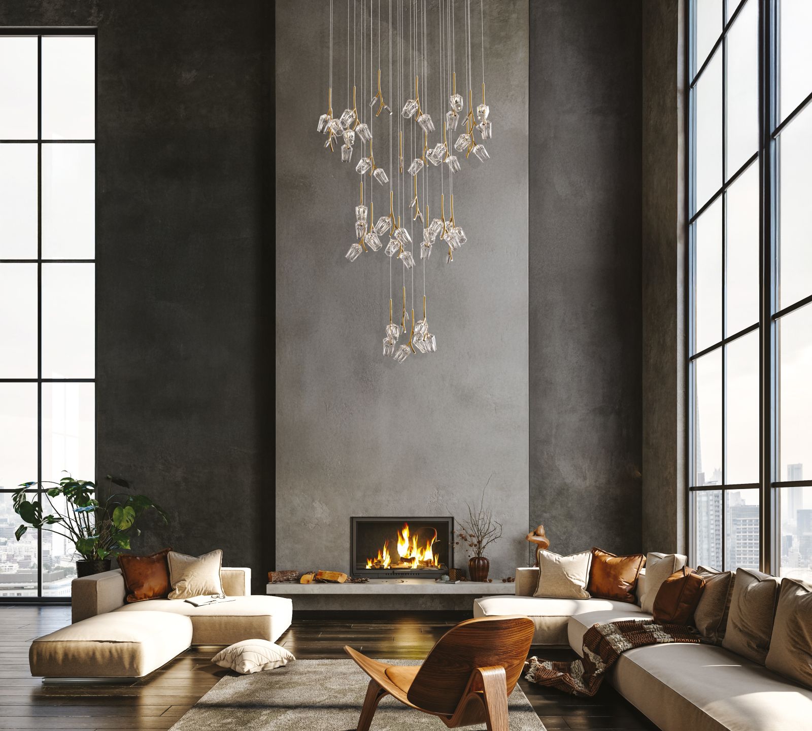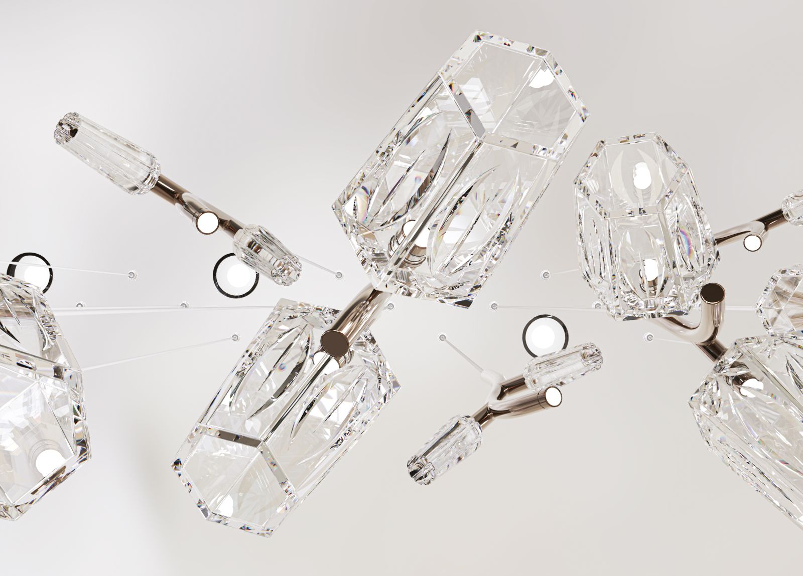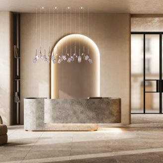 La composizione di BLOOMÉ si presta a diverse e molteplici interpretazioni stilistiche. Per chi predilige un’estetica più rigorosa, è disponibile con cavi di sospensione di uguale lunghezza, offrendo un risultato più lineare e spiccatamente architettonico. In alternativa, si possono utilizzare cavi di lunghezze variabili, una soluzione che restituisce il movimento naturale e organico di un bouquet sospeso. Questa versatilità permette a BLOOMÉ di adattarsi armoniosamente a contesti differenti, spaziando dalle più esclusive realtà contract fino ai più eleganti progetti residenziali.