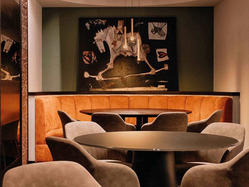 Il modello Carmen ritorna poi negli spazi della sala gourmet del ristorante gastronomico Bianca sul Lago, dove le sedute sono state rivestite con soffice rivestimento Econabuk con schienale trapuntato, a creare un sofisticato gioco di geometrie e volumi.