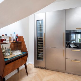 Infine, per completare l’ambiente cucina, Abimis ha realizzato un ampio programma di colonne, sempre in finitura orbitata e maniglie in ottone, che ospita forno, frigoriferi, vani dispensa e una cantina vini professionale.