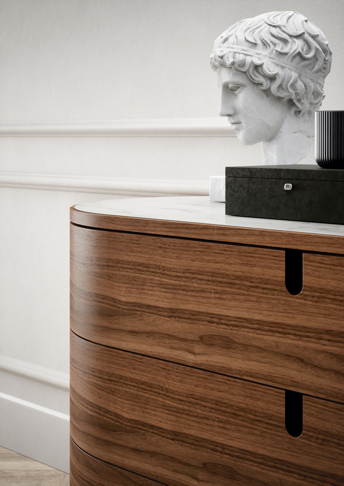 L’elemento che definisce il carattere della serie è senza dubbio la maniglia a incasso, arricchita da un inserto brunito che non solo eleva la raffinatezza artigianale del mobile, ma ne facilita l’utilizzo integrandosi con estrema naturalezza nel profilo curvo. Questa coerenza formale prosegue nella meccanica dei cassetti, caratterizzati da un’apertura a estrazione totale che segue fedelmente il profilo ellittico della struttura, garantendo una continuità estetica anche nel momento dell’apertura e svelando volumi interni generosi.