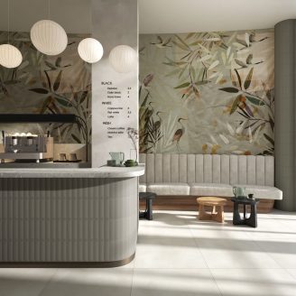 Le piastrelle vengono infatti assemblate come un enorme gioco di costruzioni e disposte in modo grafico, attingendo a una complessa melodia di volumi e texture per esplorare spazialità, modularità e ripetizione in modo originale, sprigionando vibrazioni positive.