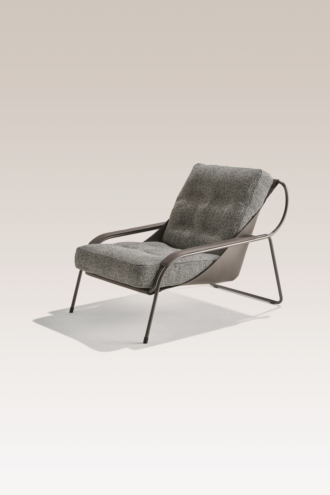 Nata per abbandonare la tradizionale concezione della poltrona artigianale e introdurre un nuovo sistema costruttivo pensato per la produzione industriale di serie, la poltroncina Maggiolina appare ora ancora più contemporanea con il contrasto materico tra il tessuto dei cuscini, il cuoio dei braccioli e della scocca e il metallo della struttura.