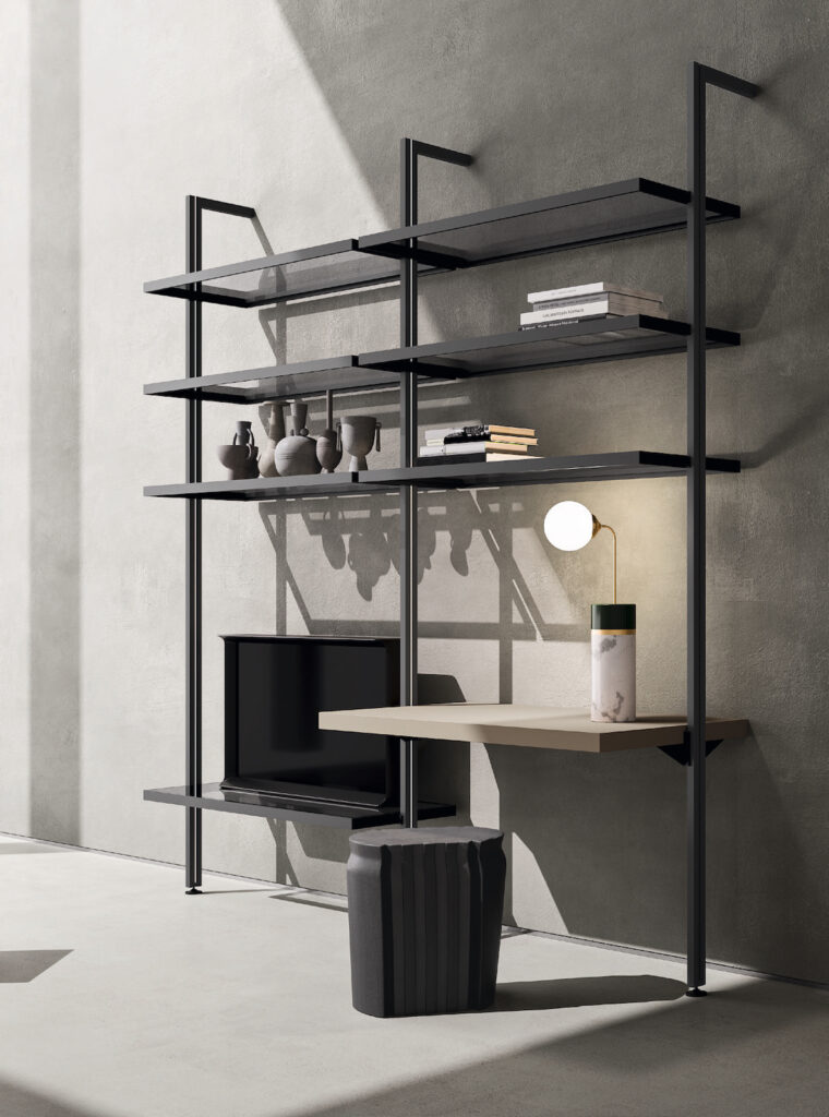 La seconda soluzione, più articolata della precedente, è la CABINA WINDY, un sistema caratterizzato da pali a parete o a soffitto, con luci a Led posizionate sul fianco del montante, in cui una delle mensole è un piano scrittoio: il design ricercato e l’elegante accostamento con le mensole in vetro consente il suo posizionamento sia nella zona notte che nella zona giorno.