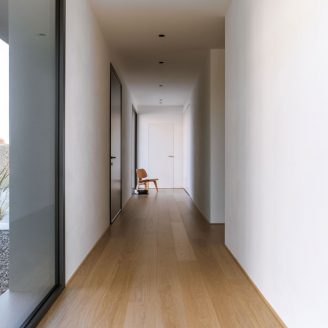Il primo volume, di altezza ridotta, ospita gli spazi di servizio, garantendo una separazione efficace dalle aree più pubbliche della casa. Il secondo volume, con un’altezza maggiorata, contiene la zona ingresso e notte, fornendo uno spazio accogliente e riservato. Il terzo volume, caratterizzato da una doppia altezza, accoglie il soggiorno e si apre su un portico che introduce la piscina esterna, integrando coerentemente gli spazi interni e quelli esterni.