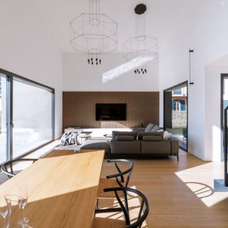 L’illuminazione naturale è un elemento chiave del progetto, con ampie aperture che rendono la casa estremamente luminosa; faretti e strip led a scomparsa contribuiscono a creare un’atmosfera calda e accogliente. Nella zona giorno, i lampadari dominano la doppia altezza, aggiungendo un tocco estetico distintivo.
