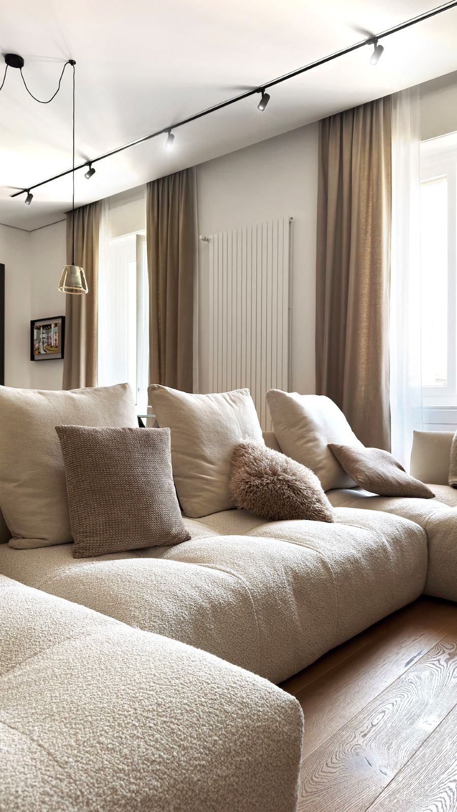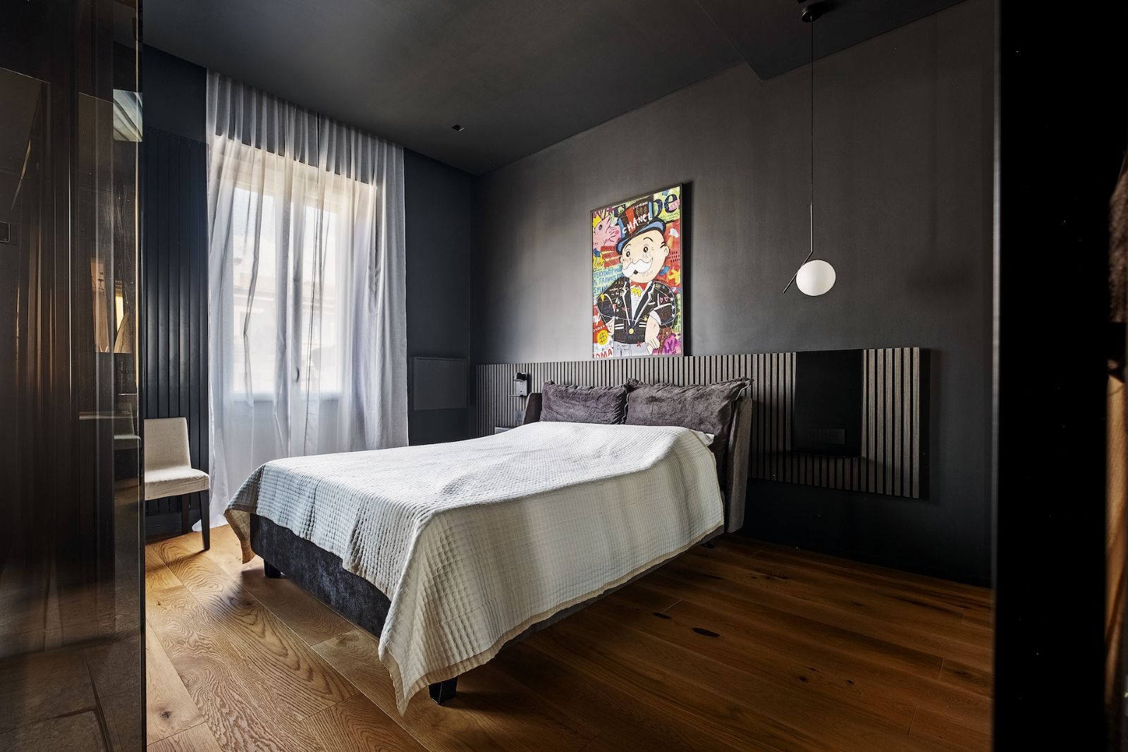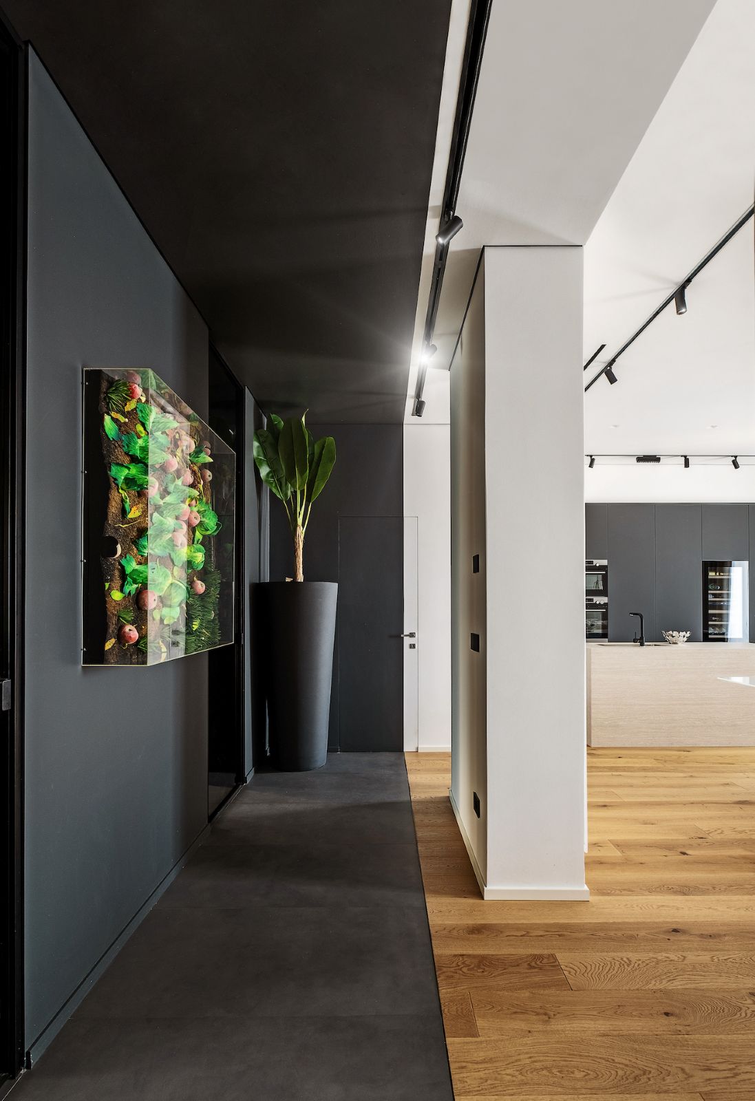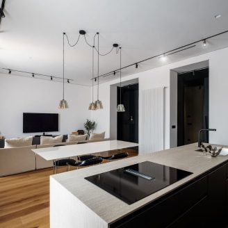 Il tema portante è il dualismo cromatico: un equilibrio dinamico che separa nettamente le funzioni dell’abitare. La zona giorno, chiara e luminosa, è dedicata all’azione e alla convivialità; qui il fulcro è la cucina con isola in travertino naturale, realizzata su misura da artigiani locali, che si staglia contro colonne grigio antracite. Il parquet in rovere biondo attraversa ogni stanza come un tappeto continuo, garantendo calore e coerenza visiva a tutto l’appartamento.