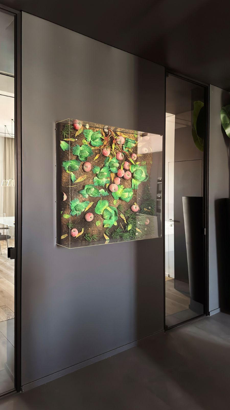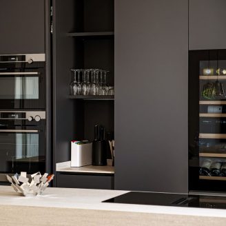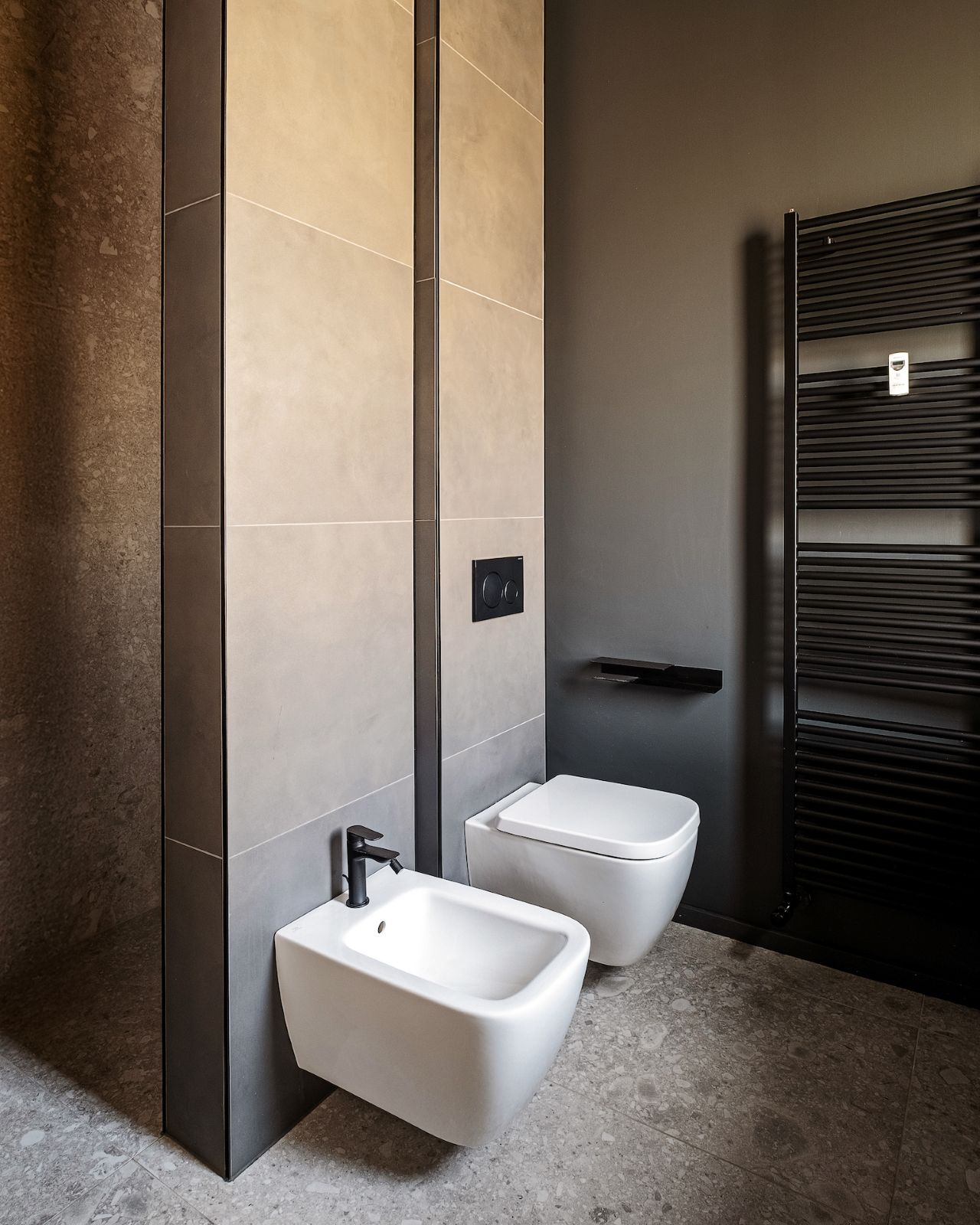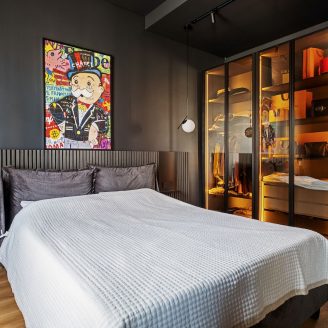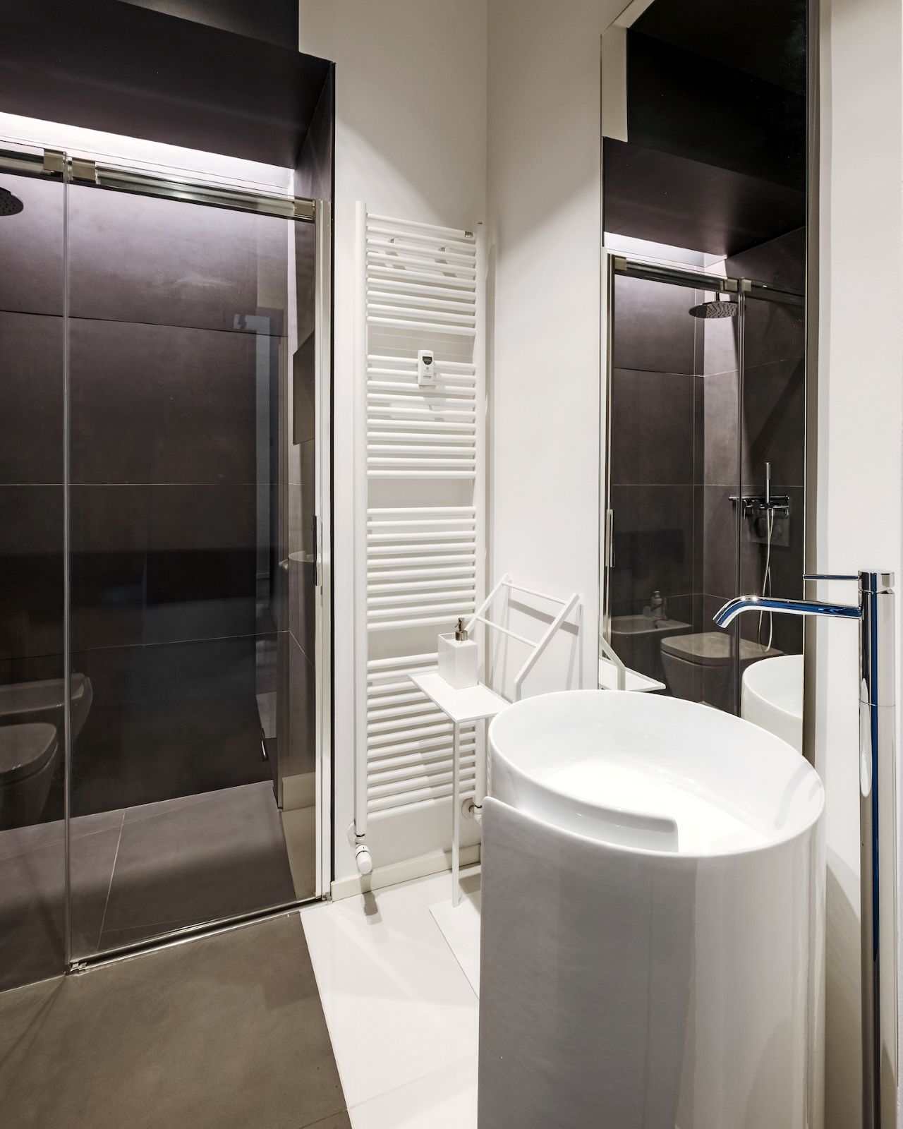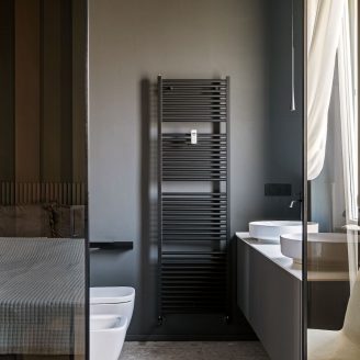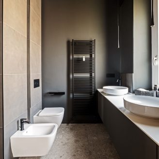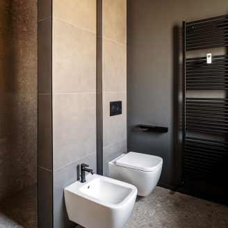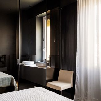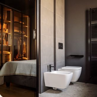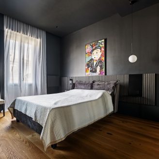 Al contrario, la zona notte evoca il raccoglimento attraverso tonalità scure e vellutate. La camera padronale è concepita come una suite privata, dove il bagno si apre verso la stanza tramite pareti in vetro fumé, creando l’effetto di una teca preziosa. Anche l’integrazione impiantistica segue questa logica di precisione: la climatizzazione è nascosta in sapienti giochi di velette, dove le lame nere del sistema di raffrescamento si integrano geometricamente con i binari dell’illuminazione.