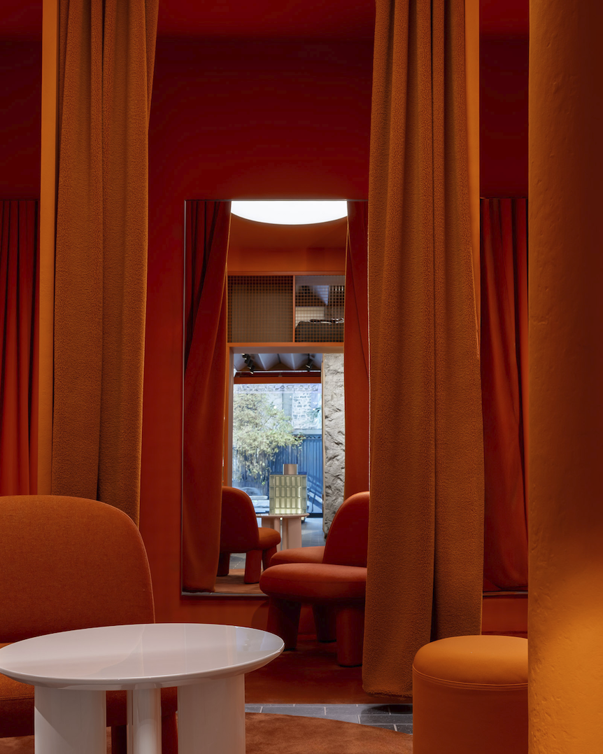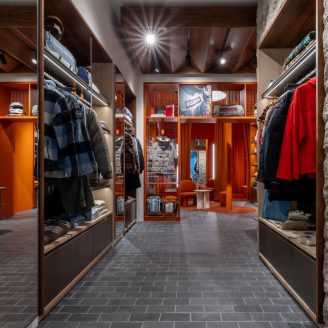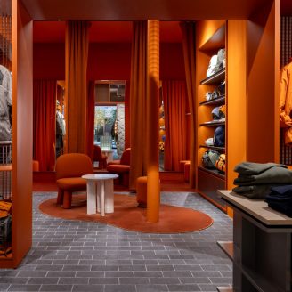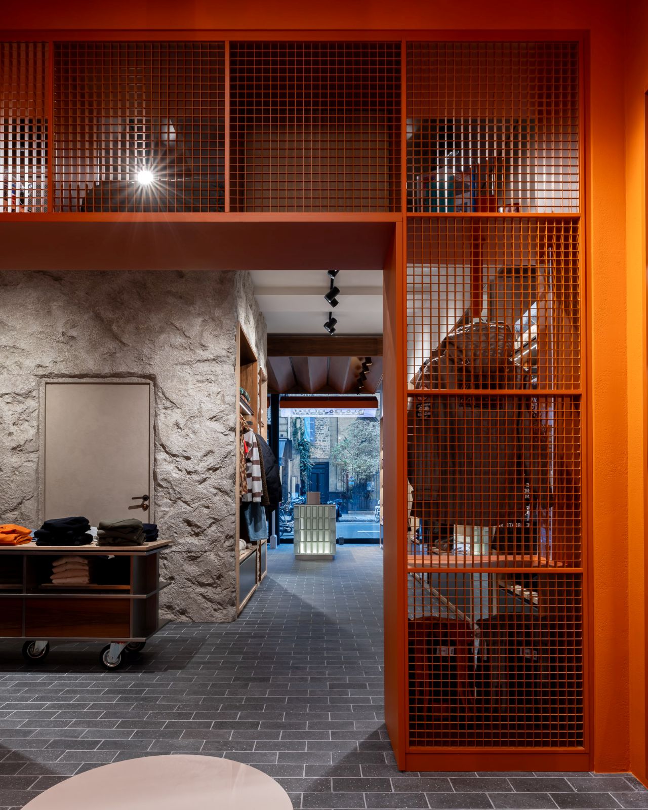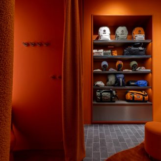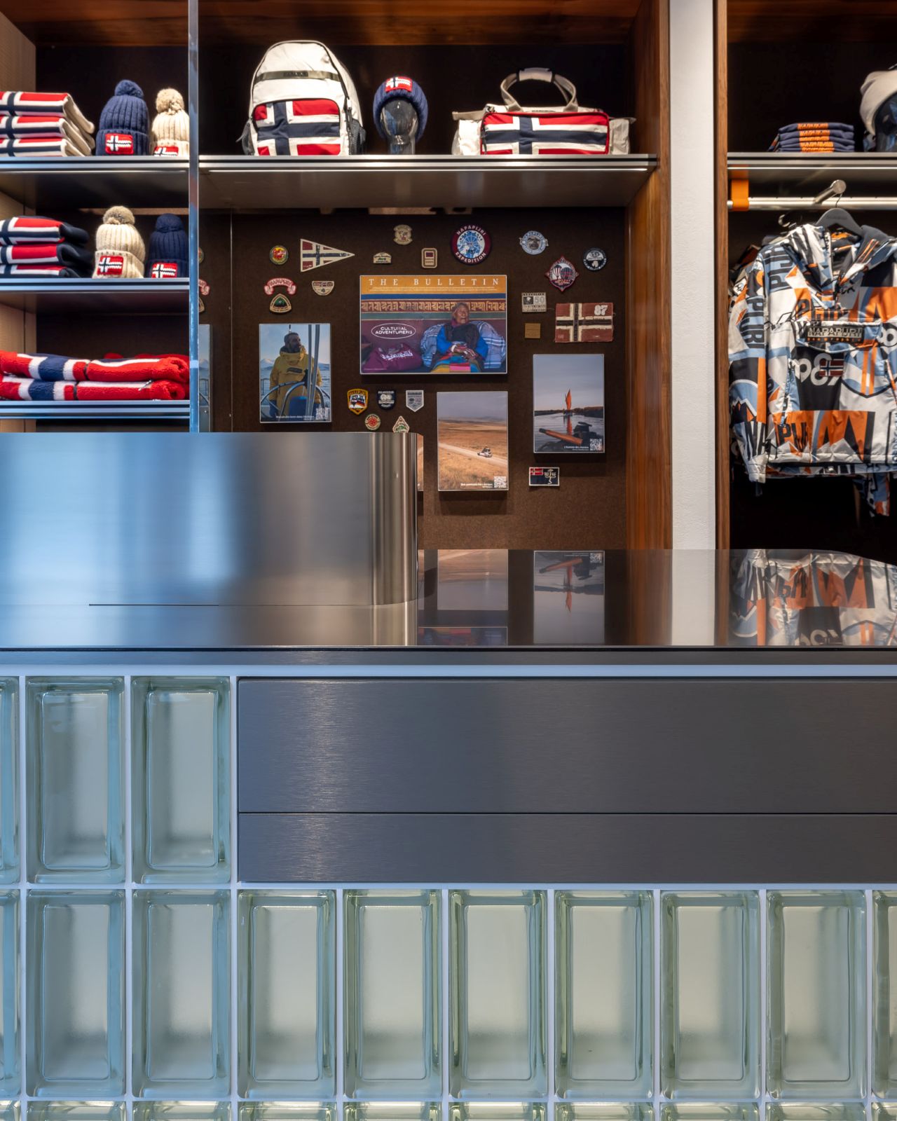 Il cuore narrativo del progetto è l’Open Archive: una grande libreria metallica che raccoglie oggetti d’archivio, materiali storici e capi iconici, fungendo da diario aperto sul passato e sul futuro di Napapijri. Ogni dettaglio, inclusa l’applicazione dell’arancione Pantone Napa, cifra visiva del brand, contribuisce a rendere tangibile la storia e la ricerca del marchio.