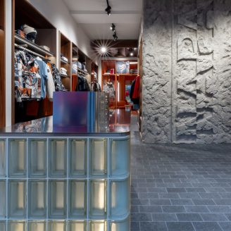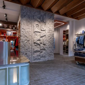 Il punto di partenza è l’Urban Shell, un guscio architettonico e materico che si apre verso la città. Questo paesaggio urbano è composto da materiali autentici come il cemento testurizzato, il metallo zincato, il legno grezzo e la pietra naturale, bilanciando tonalità calde e fredde. Il soffitto in cemento e il pavimento in tonalità grigio basalto richiamano l’asfalto cittadino, accentuando il carattere metropolitano dello store.