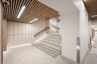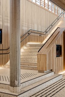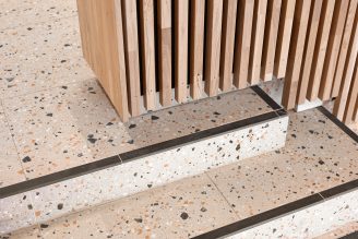 Il fulcro estetico e funzionale del rivestimento di pavimenti e gradinate è stato individuato in Venice Villa, la collezione in gres porcellanato a tutta massa Full Body3 di FMG Fabbrica Marmi e Graniti. La scelta della tonalità beige ha permesso di instaurare un dialogo armonioso con i toni caldi del legno e la freddezza del cemento presenti nel contesto, mentre la tessitura grafica del materiale evoca la naturalezza della pietra, agendo come elemento di connessione visiva tra le diverse componenti architettoniche.